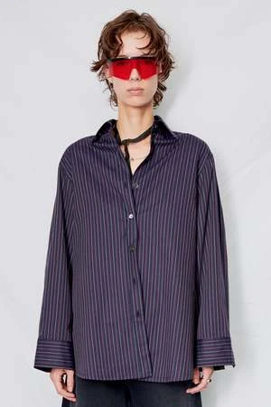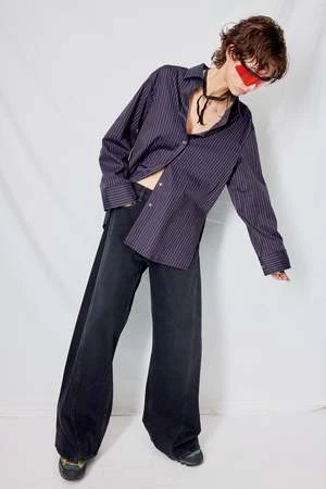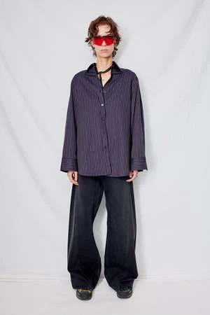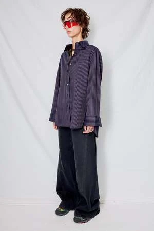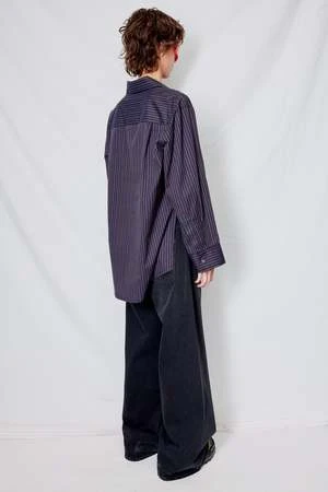 Dark Navy Stripe Cotton Oxford Shirt from Assembly New York. Relaxed fit. Button front closure. Side vents.